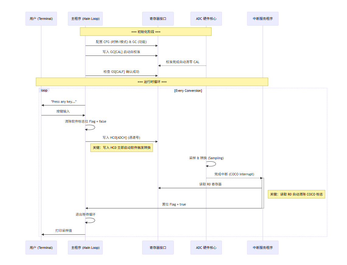 Note right of Main: 关键:写入 HC0 立即启动软件触发转换